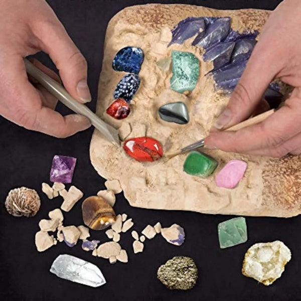 Com ele, as crianças podem cavar e revelar pedras preciosas e cristais reais, transformando aprendizado em diversão e despertando a curiosidade científica de forma prática e envolvente.